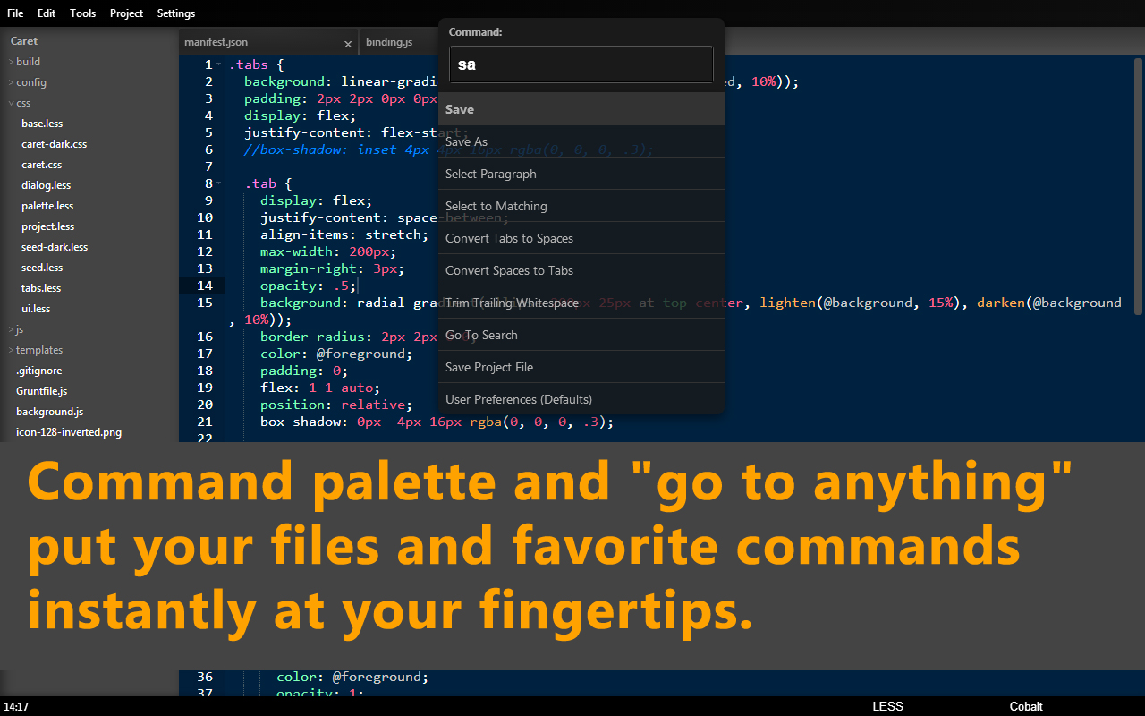 "Professional-strength" is a serious claim: is it justified? Not every editor is for everyone. But Caret has been used to write its own code (HTML, LESS, JavaScript, and build files) since version 0.0.16, ensuring that it's always tested under serious real-world conditions.