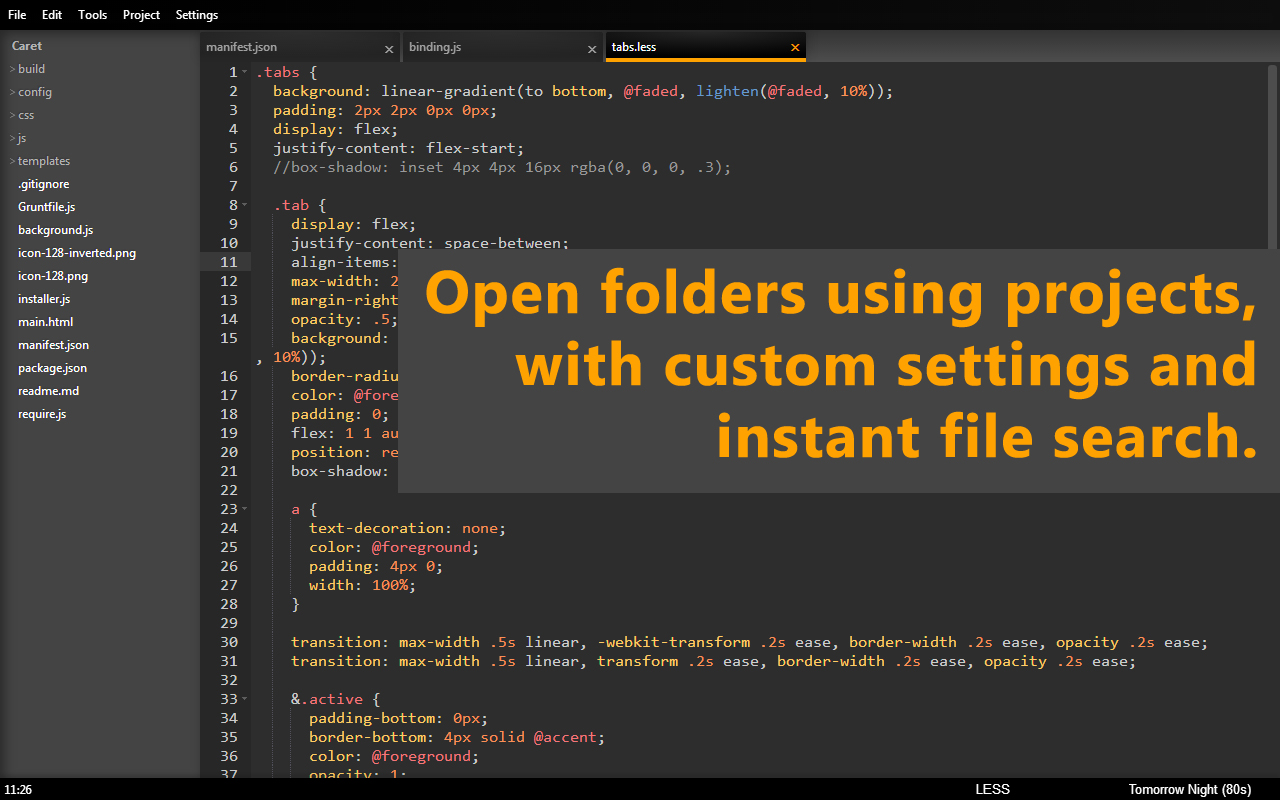 Like most good editors, Caret will open a folder and present a browseable tree view. It'll even search that folder from the command palette. But with project files, you can also override any setting on a per-project basis, and switch between them quickly. It's perfect for moving between projects with different code styles or file types.