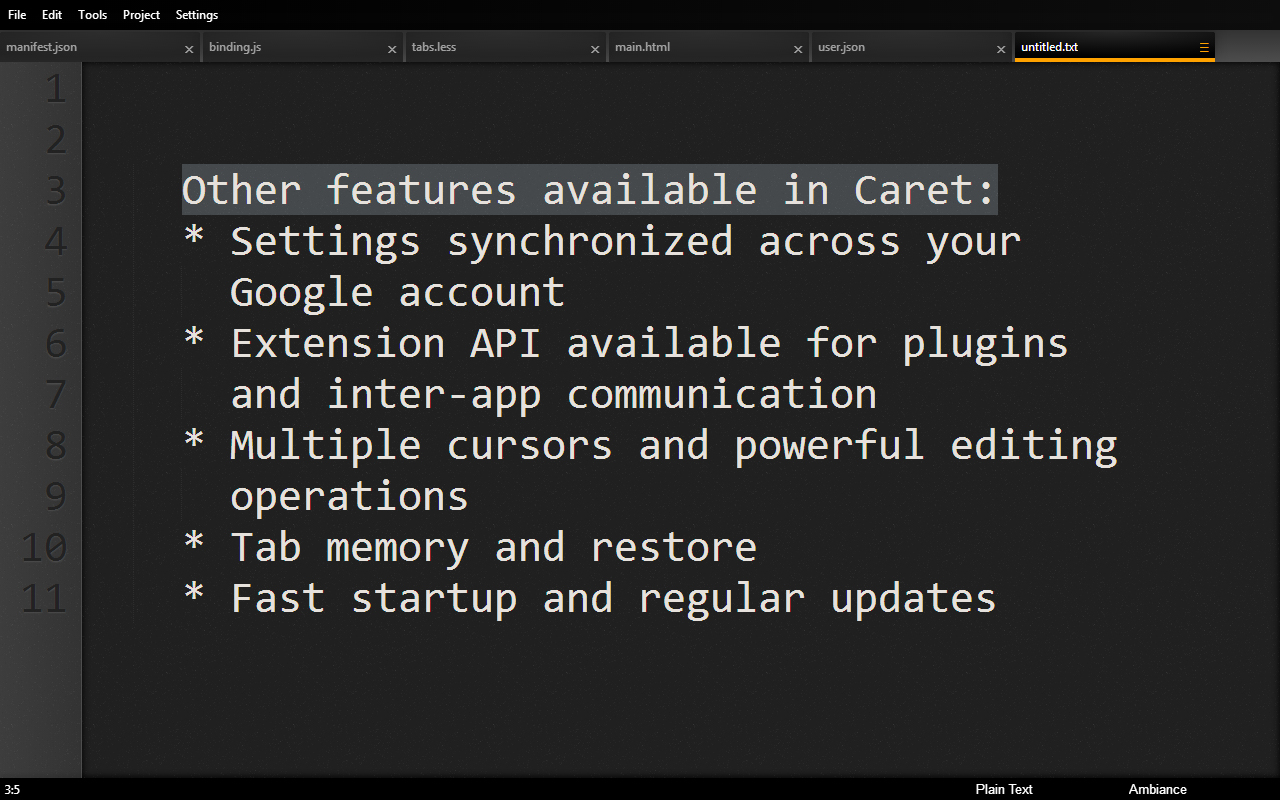Based on the amazing Ace editing component, Caret brings professional-strength text editing to Chrome OS. With Caret, you no longer need to install a second OS to get what other platforms take for granted: a serious editor for local files, aimed at working programmers.